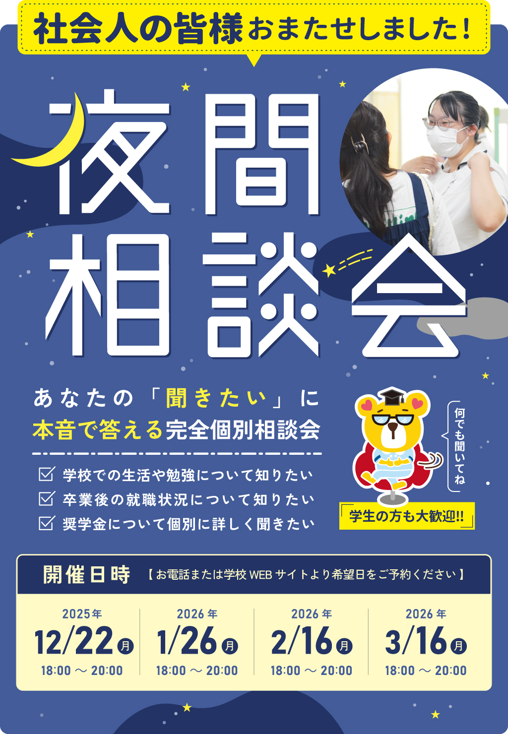 社会人の方のお仕事帰り、高校生の学校帰りや保護者の方のお仕事帰りにご参加できるよう、平日夜間の個別相談会を開催します。